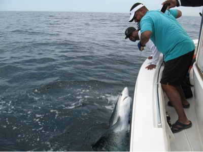 Had Gerald back with buddies, Eric, Hal, Ted, Dennis and newcomer Will. Plan was to go offshore and bottom fish and shark. This morning I decided to go back to the where I caught the stripers last night, my mate was crushing them when I left the dock so I decided to try that first. First drift had 3 on, to 35lbs. Dropped the fish off and went offshore, by the time I got out all of my favorite wrecks had dive boats on them or boats parked on them. Changed gears and went sharking, in the first hour we had 5 bites and landed 3 with the whole charter doing battle, no makos just blue sharks to 8 feet but lots of fun. Great weather, crew and music made for an enjoyable day!