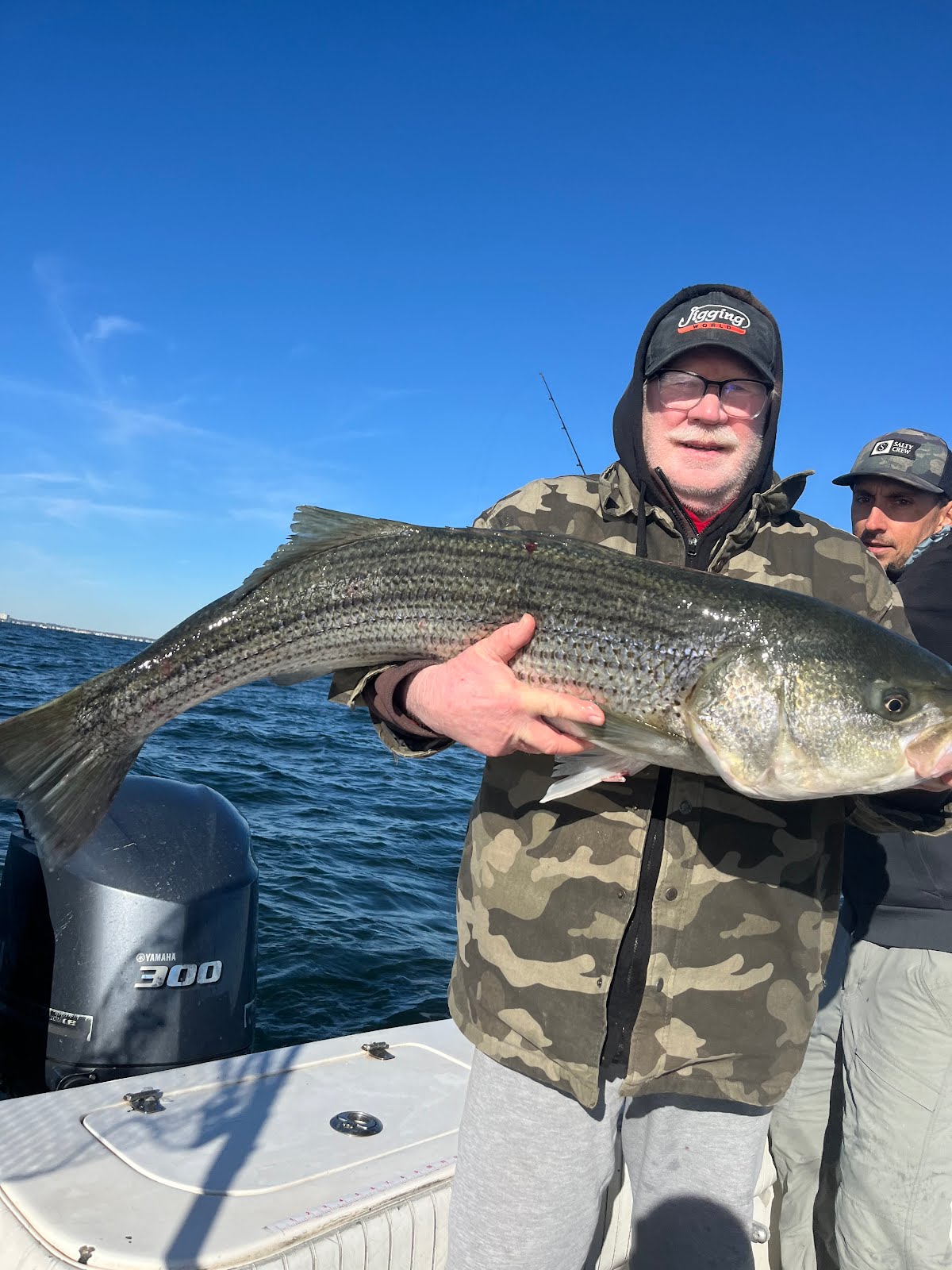 Had long time regular Rich Serpe with son Nick today. Got on the stripers early and had nice pick of fish from 35-40 inches. Lot of fun on ultra light tackle!